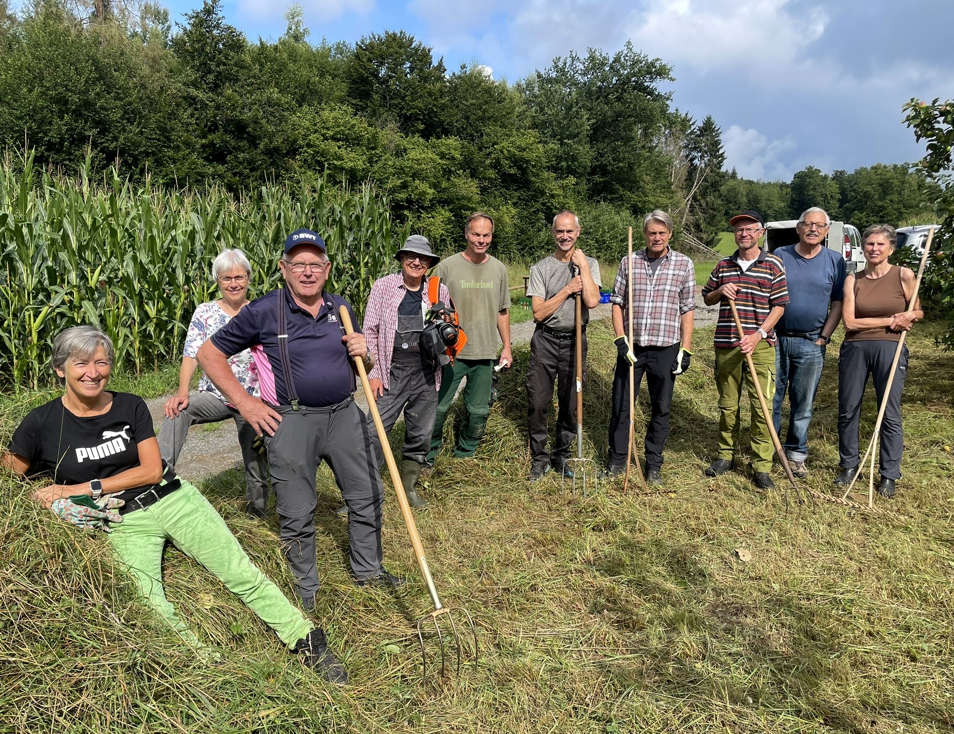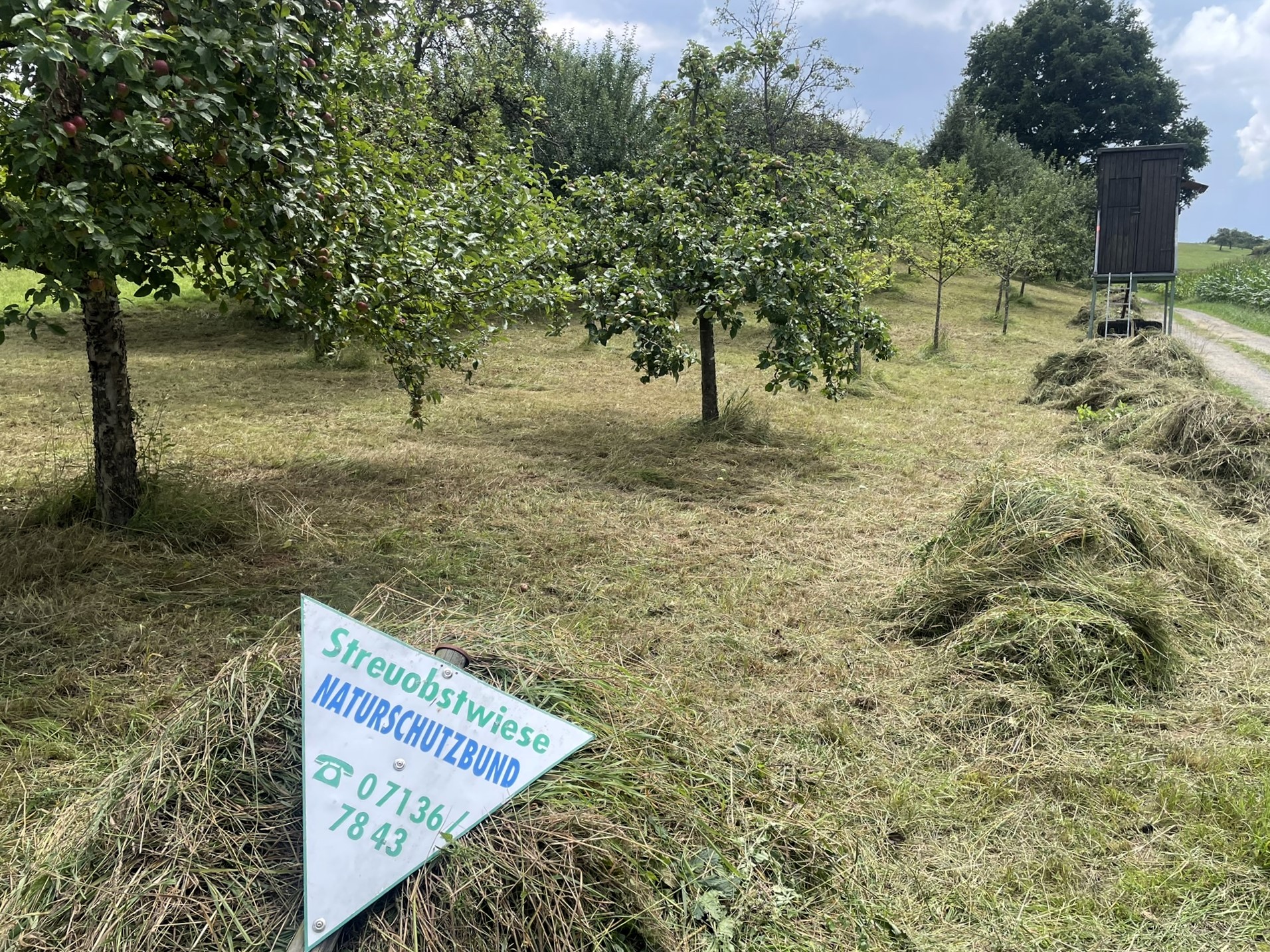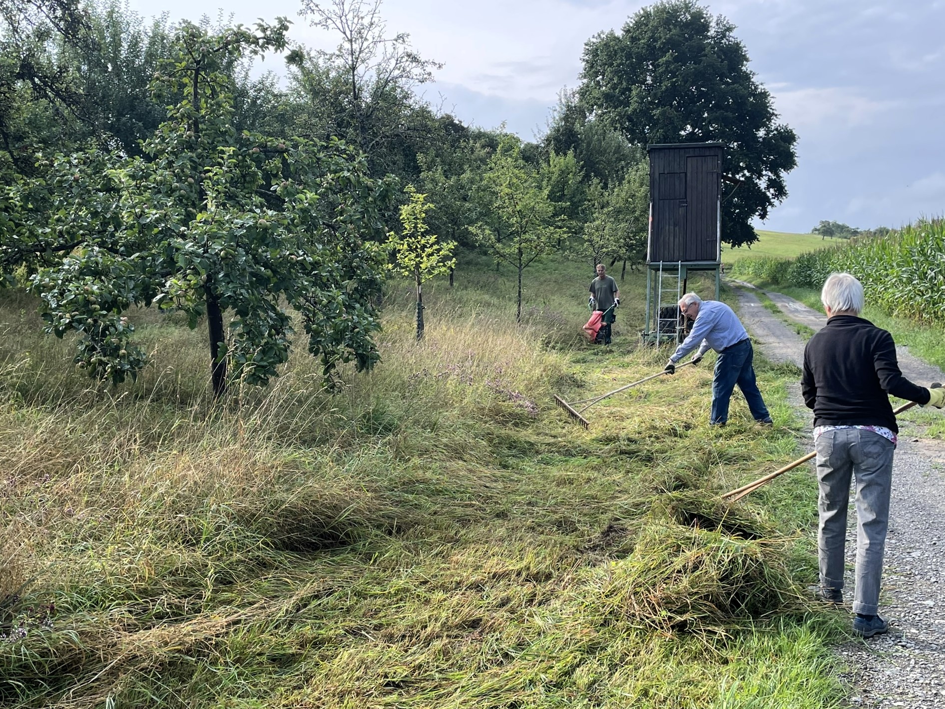Am 2. August führten elf Helfer der NABU Gruppe Bad Friedrichshall und Umgebung e.V. bei einem Pflegeeinsatz in Tiefenbach die diesjährige Mahd der NABU-Streuobstwiese und des angrenzenden Hangs durch. Während der Dauer des Einsatzes zeigte sich das Wetter glücklicherweise von seiner freundlichen Seite. Die längere Trockenphase zwischen dem morgendlichen Nieselregen und den am Nachmittag erneut einsetzenden Schauern ermöglichte das Mähen und Zusammenrechen des Schnittgutes ohne eine „Dusche von oben“.
